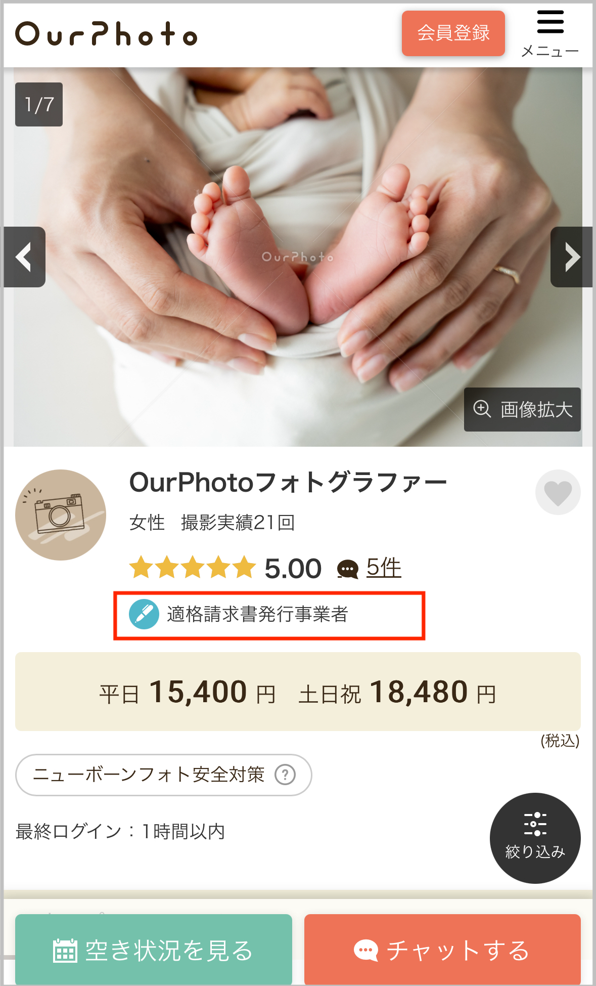 適格請求書発行事業者のフォトグラファーである場合、フォトグラファーのプロフィールページに適格請求書発行事業者であることを表示いたします。 そちらの表示をご確認ください。